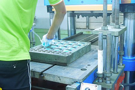 硅橡膠制品成型模具在上油壓模臺之前先洗模處理,特別是剛剛放電的新模具必須先噴砂處理。噴砂模具必須加熱到足夠的溫度,然后排料成型,并且在成型前必須噴灑脫模劑。帝博提醒,電鍍模具一定不要噴砂,包括樹脂砂噴射。