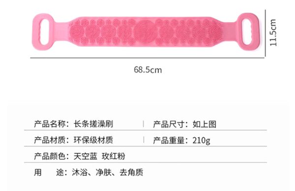 這款通用硅膠洗澡刷采用拉條式設計,單人即可輕松搓掉背部泥垢,刷子兩面都可以用,搓泥效果強力。采用硅膠材質(zhì)生產(chǎn),使用時不會刮傷皮膚,不會引起任何不適,老人、小孩都可以用。