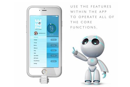 這款智能手機套是 Hello Zee 的新產(chǎn)品——即“智能通用 Zee Smart Core(智能核心)”,能夠為 iPhone、安卓手機或者平板提供128G 內(nèi)存,并且是一塊充電電池,還附帶 LED 燈和保護外殼。